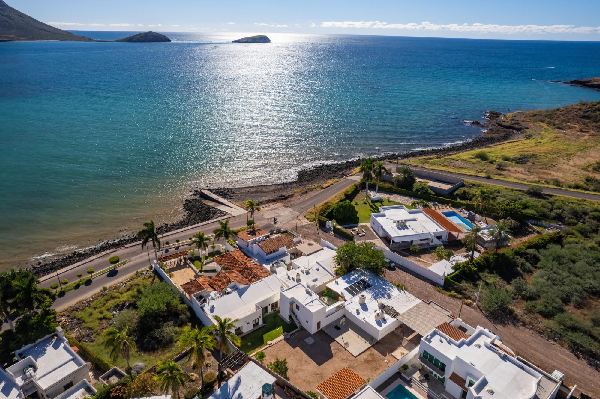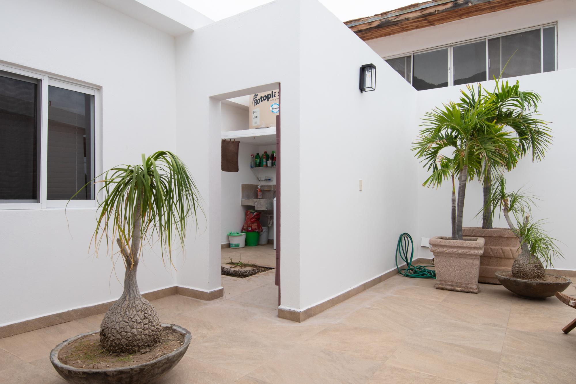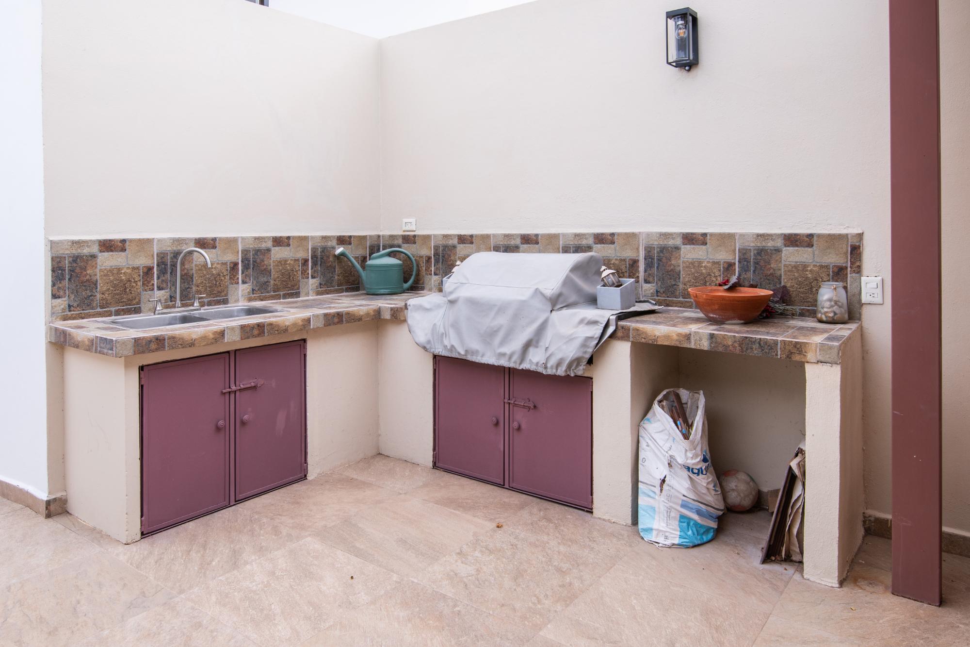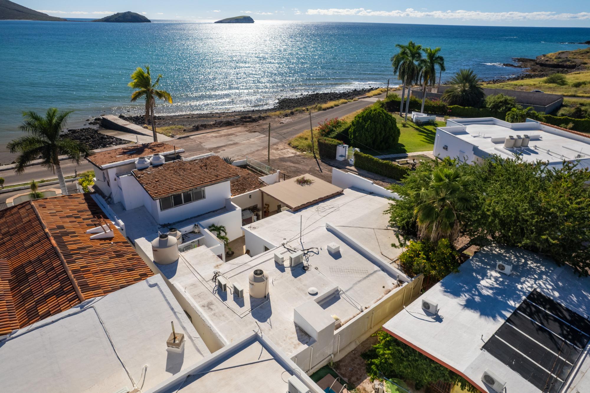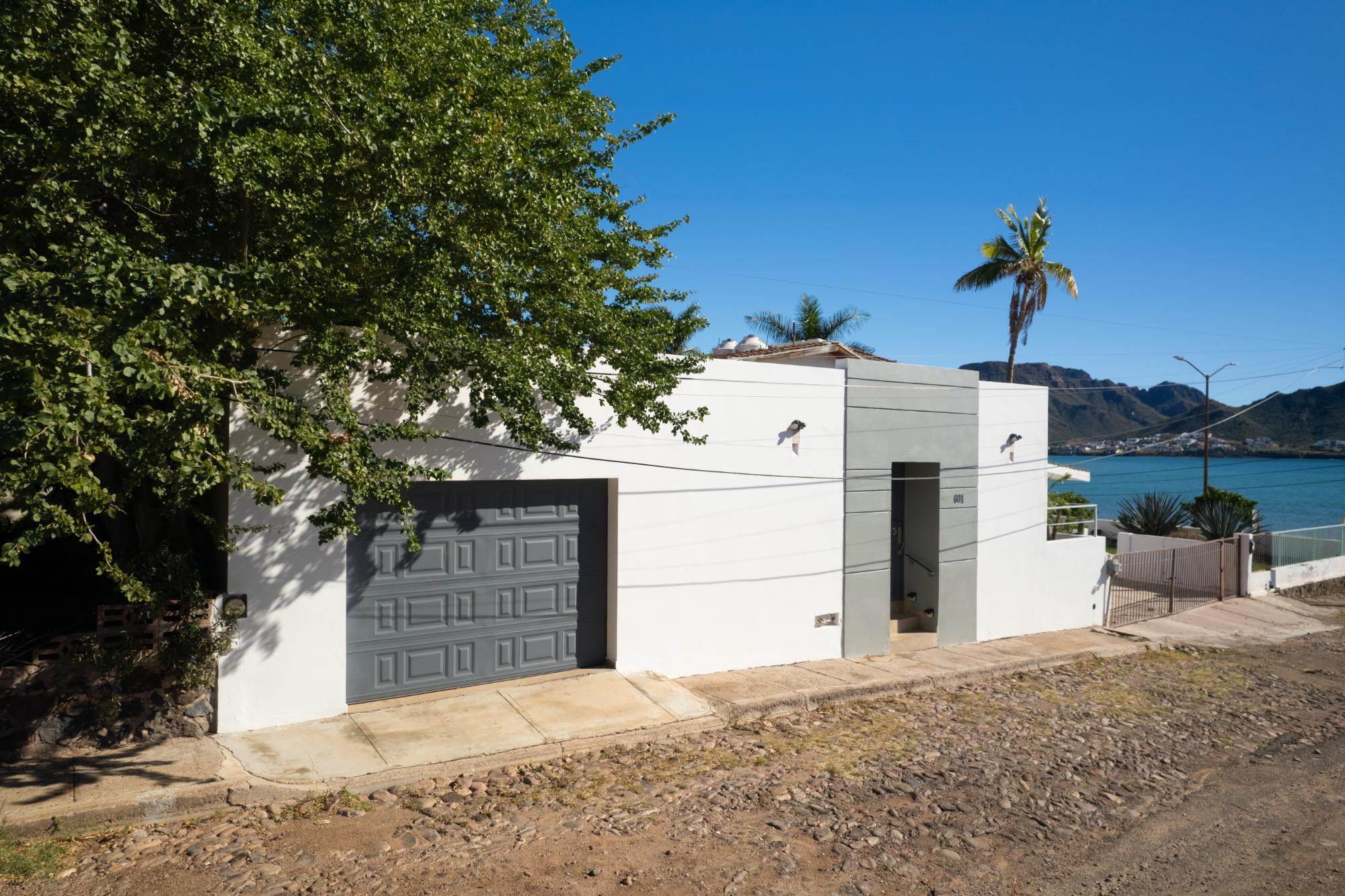 Located in the low-density residential community of Las Tinajas in Guaymas, this single-level home offers a practical layout, mature landscaping, and attractive views of the Sea of Cortez. The elevated position of the subdivision provides a quiet setting with a strong sense of privacy while remaining close to the coastline. The main house includes two bedrooms. The primary bedroom features an en-suite bathroom and access to an interior patio shared with the television room, allowing natural light into both areas. The second bedroom is served by a full bathroom located just outside the doorway. A third smaller bedroom with its own private bathroom is located separately from the main structure, making it well suited for guests or children. The home offers a comfortable terrace with a sea view and a built-in barbecue area, ideal for outdoor dining and relaxation. The property includes a welcoming front approach, off-street parking, and a functional layout.