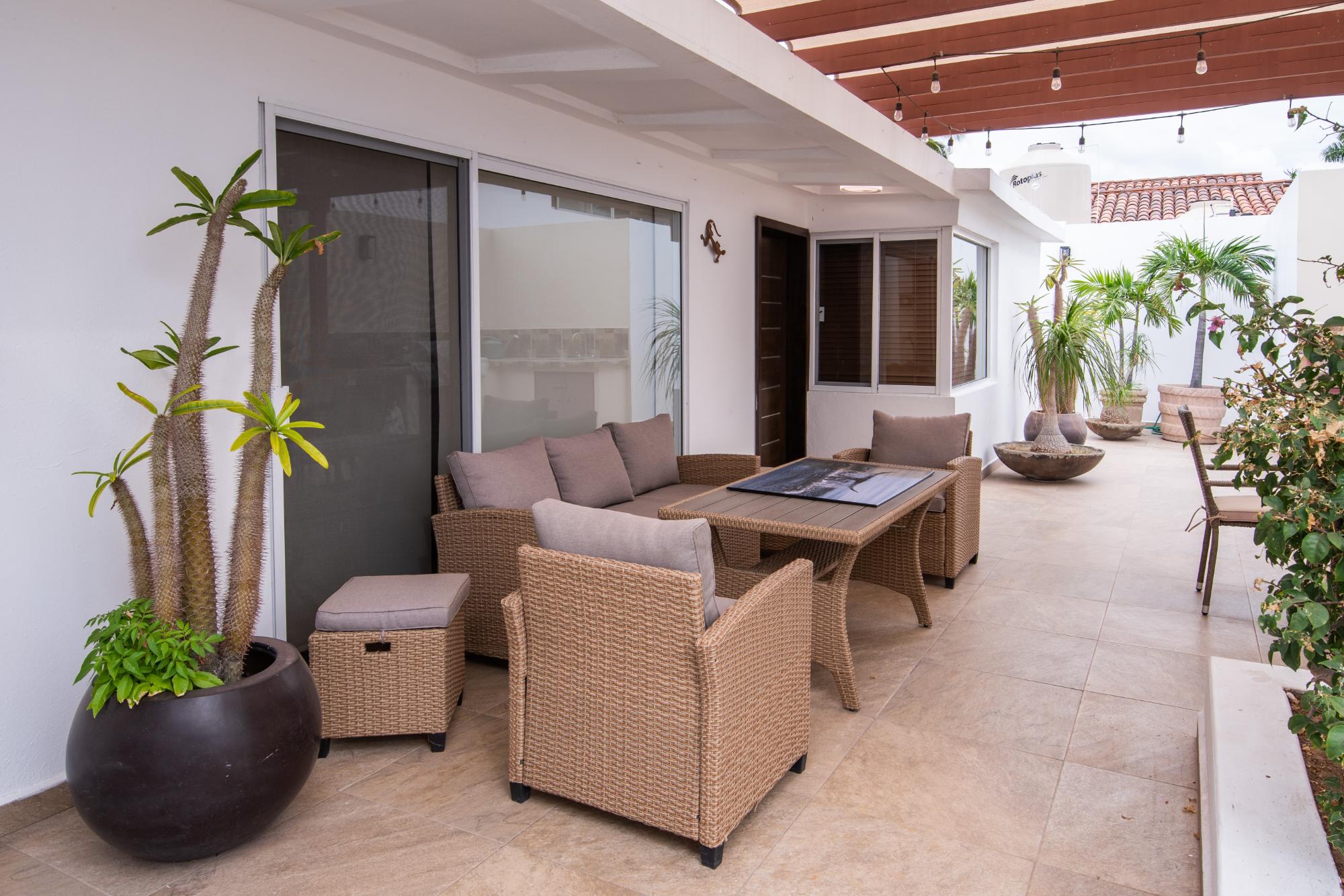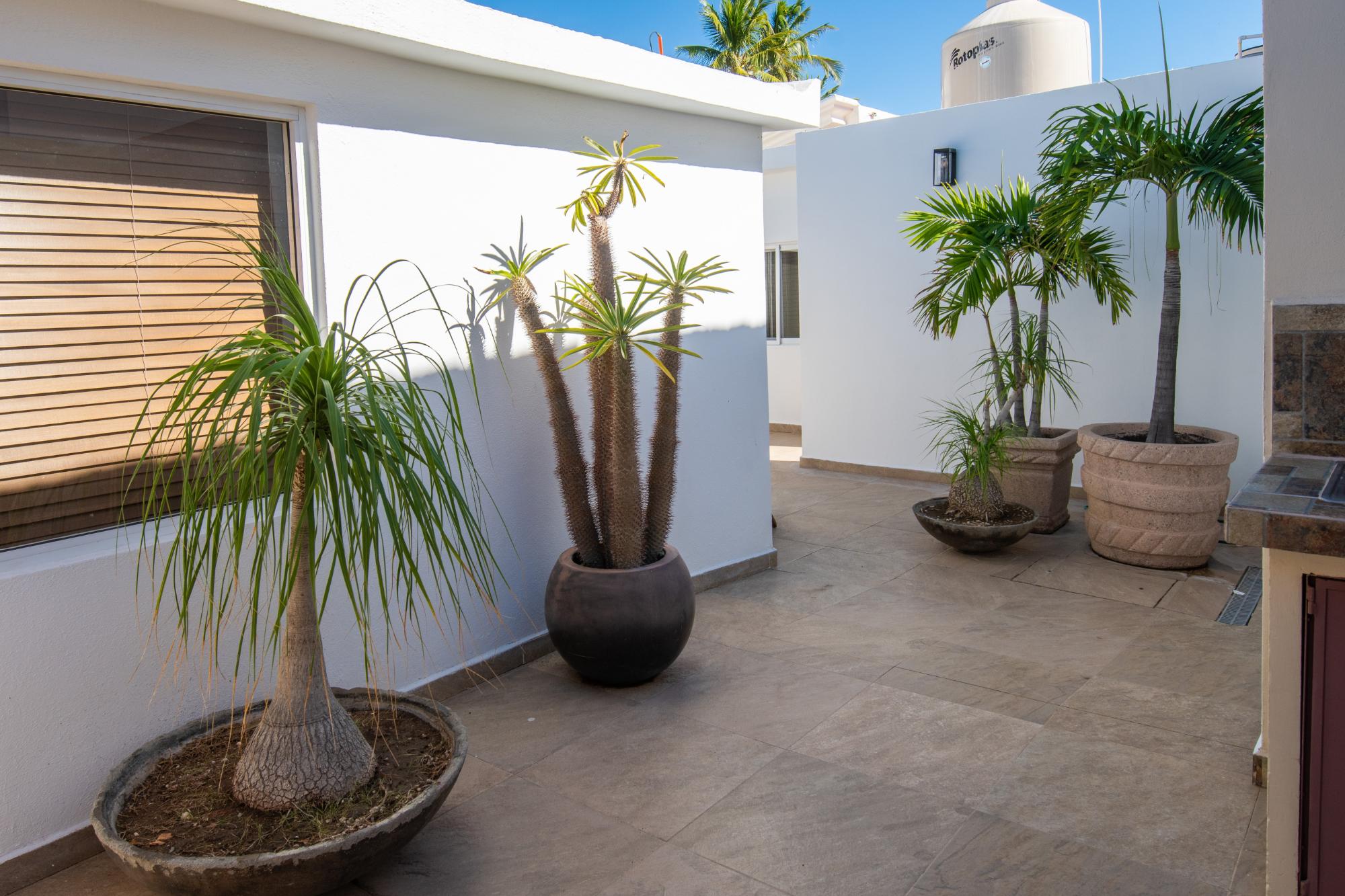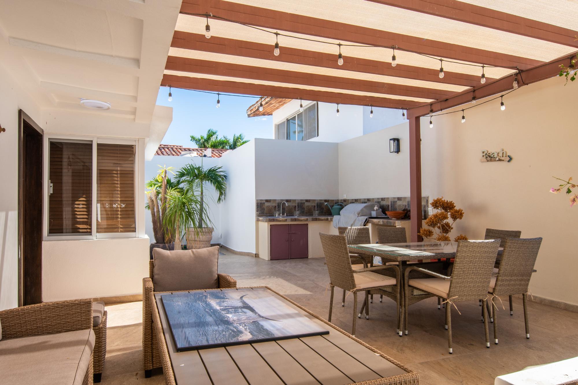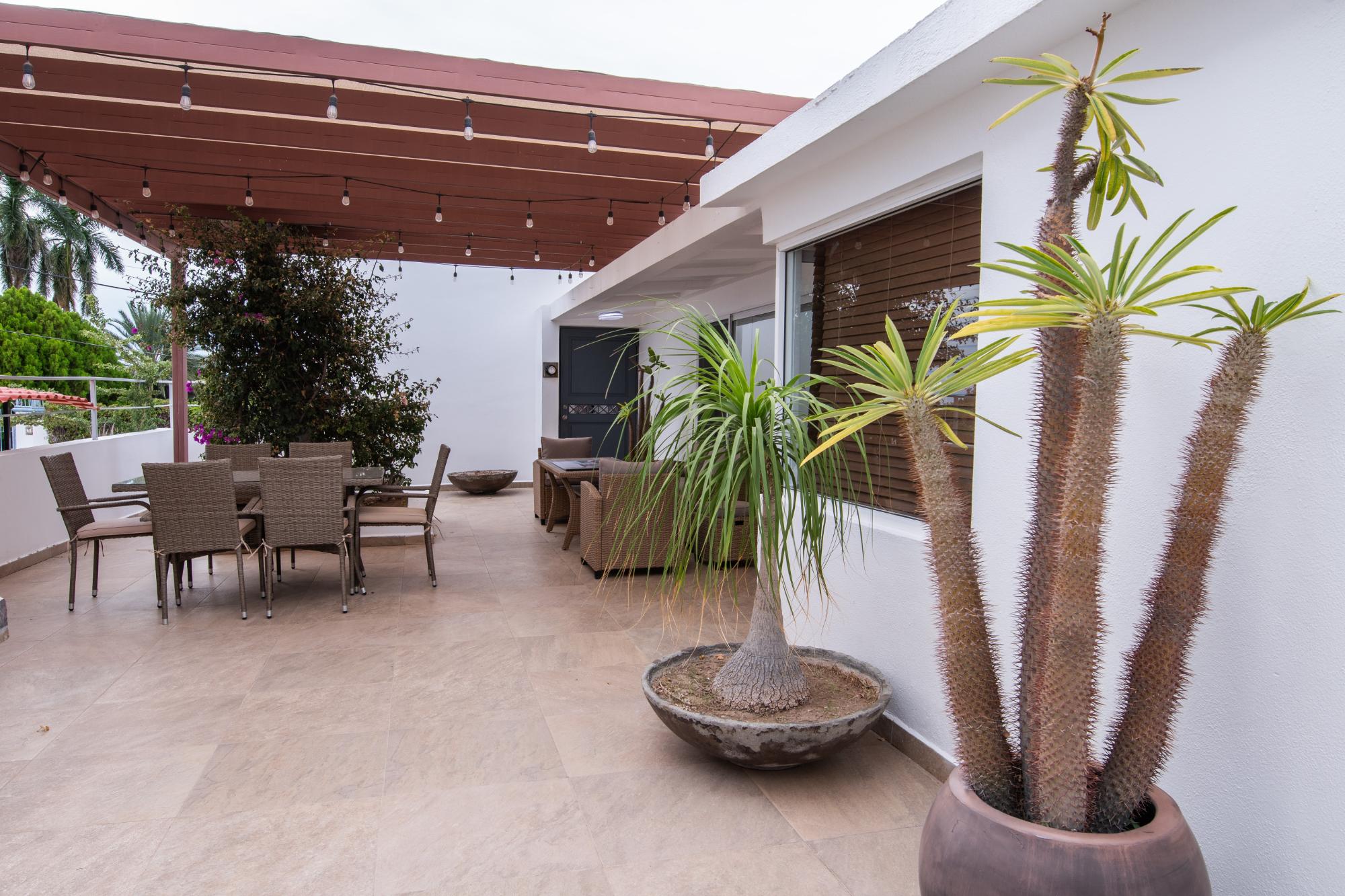 Located in the low-density residential community of Las Tinajas in Guaymas, this single-level home offers a practical layout, mature landscaping, and attractive views of the Sea of Cortez. The elevated position of the subdivision provides a quiet setting with a strong sense of privacy while remaining close to the coastline. The main house includes two bedrooms. The primary bedroom features an en-suite bathroom and access to an interior patio shared with the television room, allowing natural light into both areas. The second bedroom is served by a full bathroom located just outside the doorway. A third smaller bedroom with its own private bathroom is located separately from the main structure, making it well suited for guests or children. The home offers a comfortable terrace with a sea view and a built-in barbecue area, ideal for outdoor dining and relaxation. The property includes a welcoming front approach, off-street parking, and a functional layout.