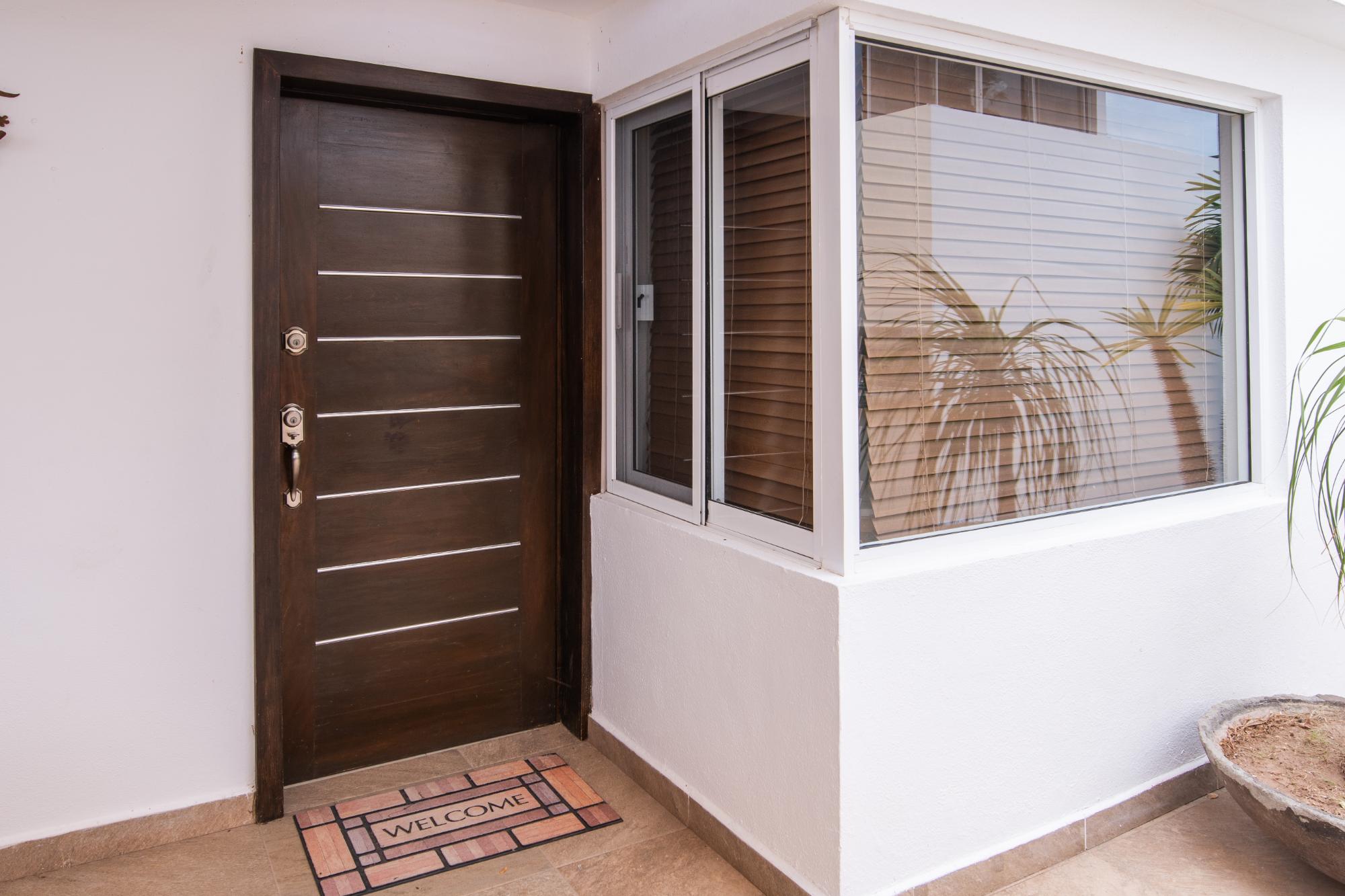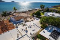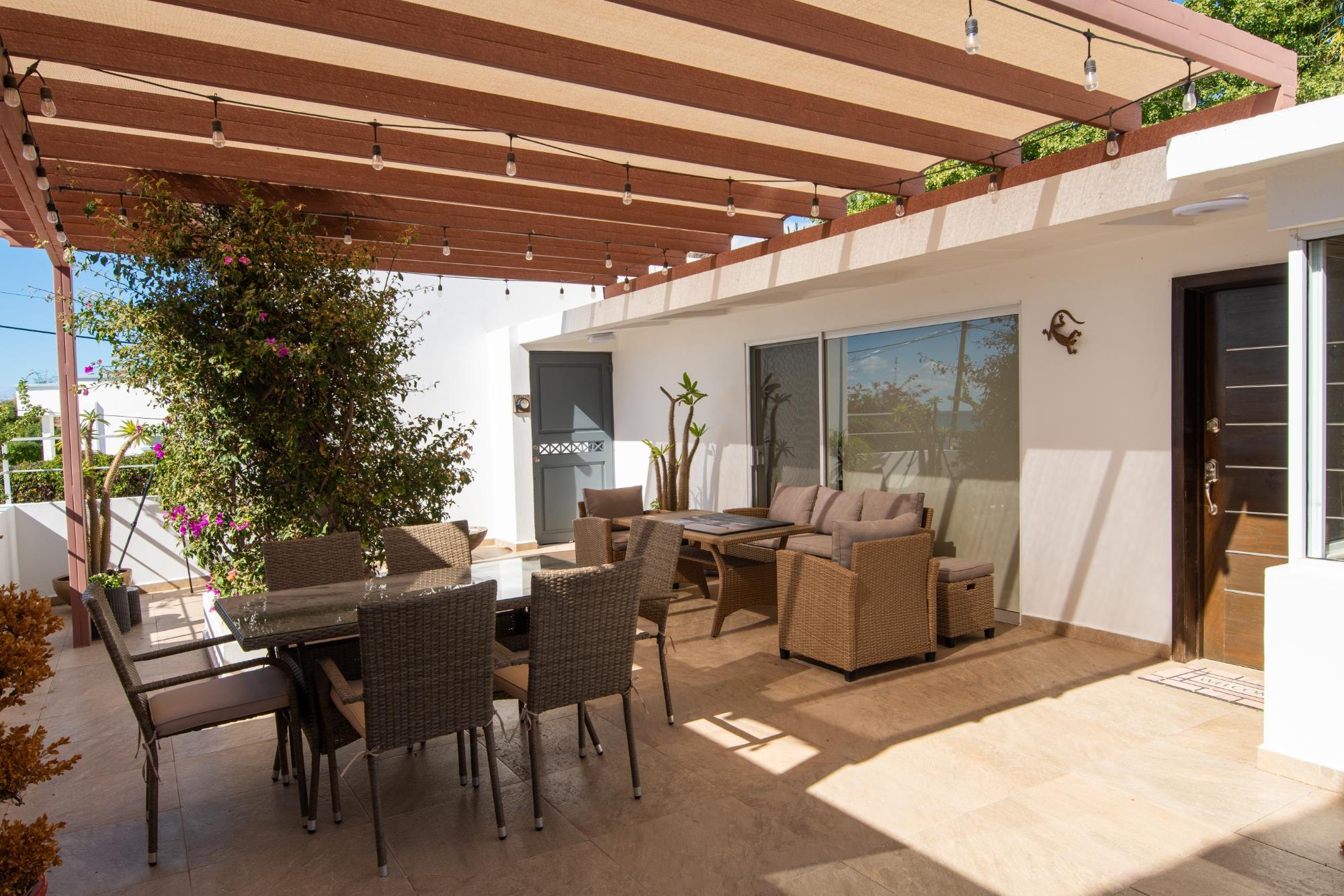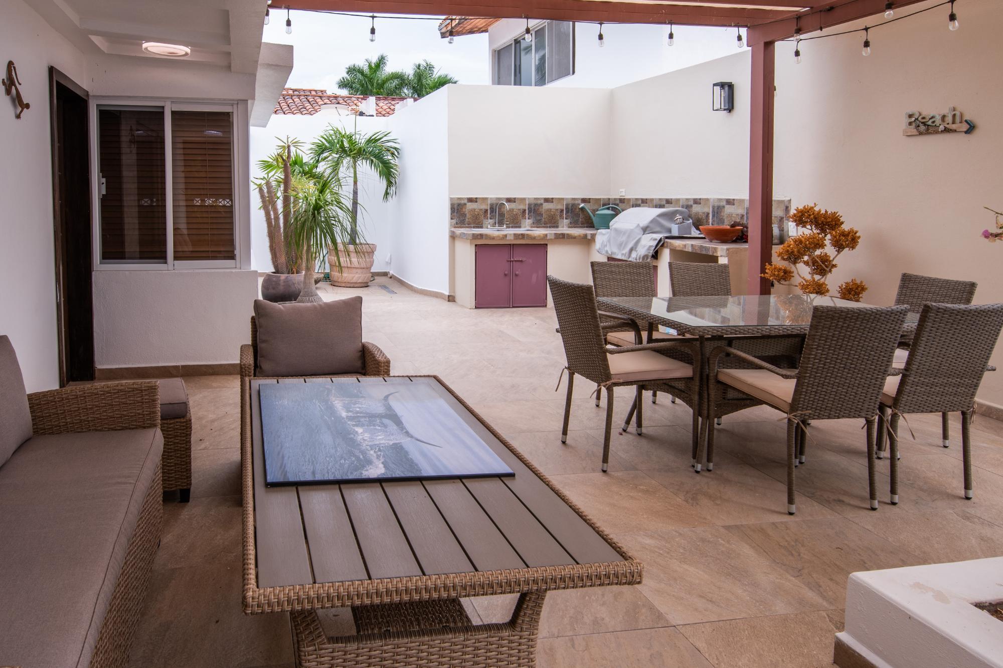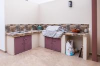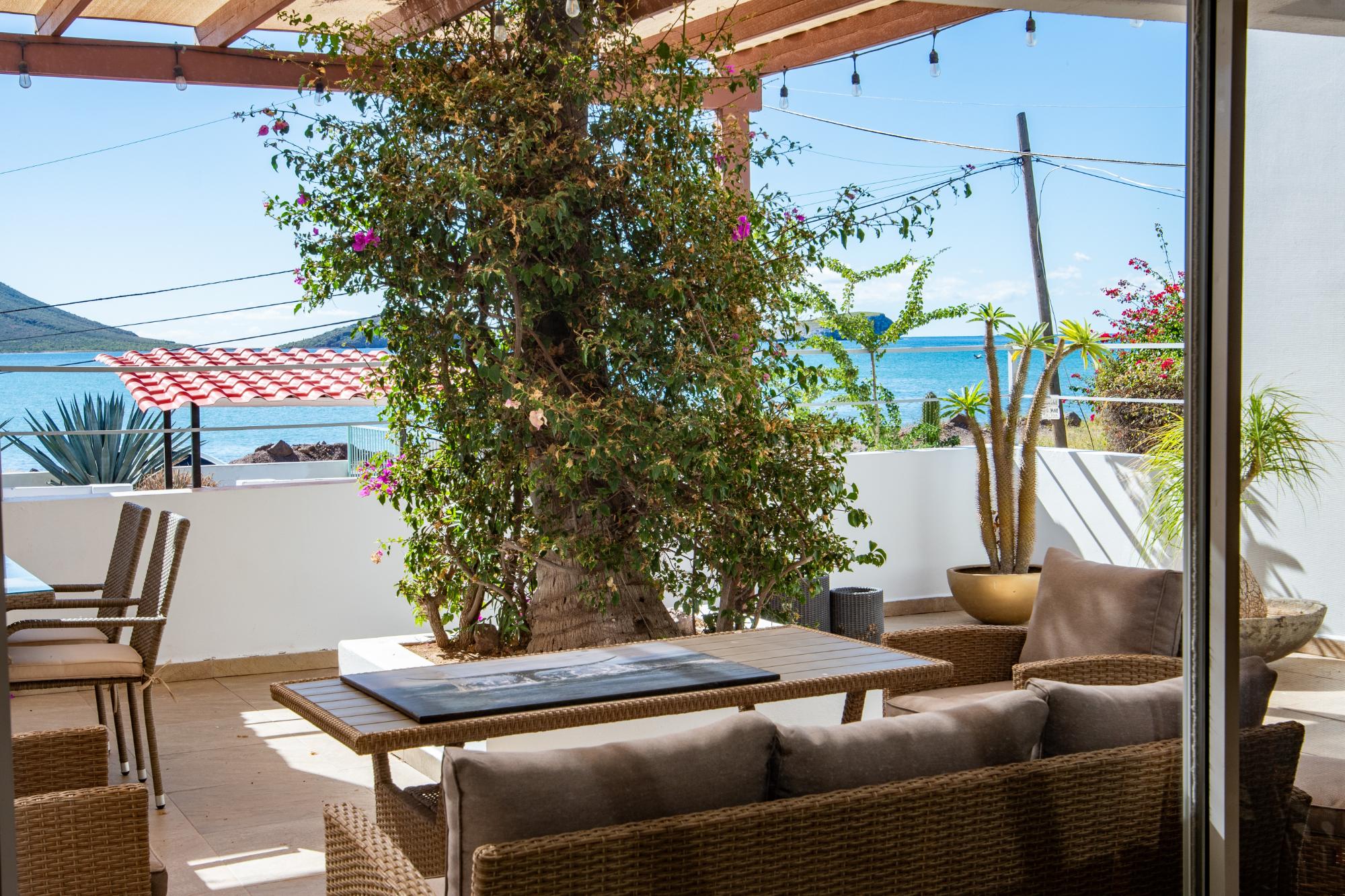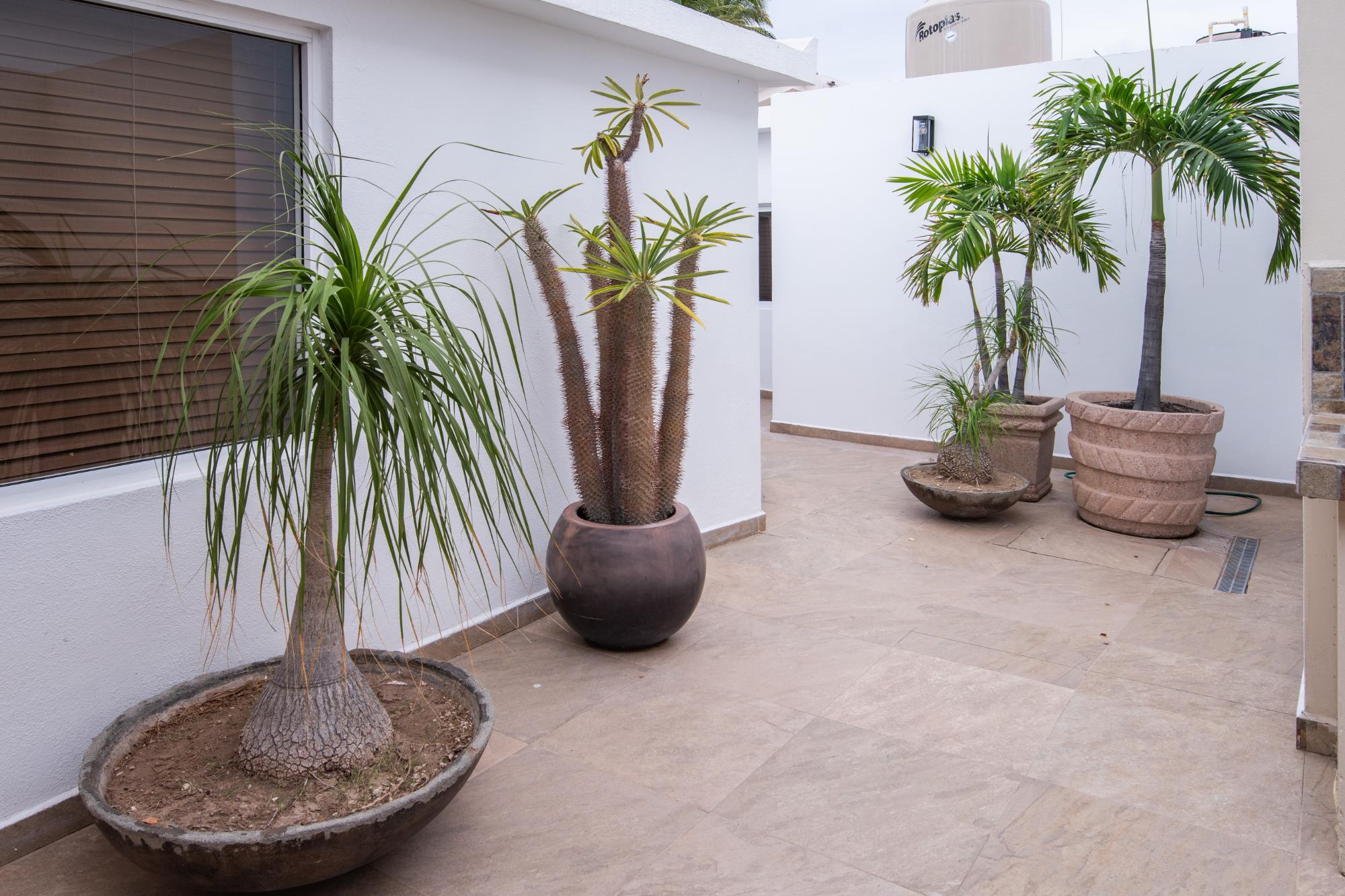 Located in the low-density residential community of Las Tinajas in Guaymas, this single-level home offers a practical layout, mature landscaping, and attractive views of the Sea of Cortez. The elevated position of the subdivision provides a quiet setting with a strong sense of privacy while remaining close to the coastline. The main house includes two bedrooms. The primary bedroom features an en-suite bathroom and access to an interior patio shared with the television room, allowing natural light into both areas. The second bedroom is served by a full bathroom located just outside the doorway. A third smaller bedroom with its own private bathroom is located separately from the main structure, making it well suited for guests or children. The home offers a comfortable terrace with a sea view and a built-in barbecue area, ideal for outdoor dining and relaxation. The property includes a welcoming front approach, off-street parking, and a functional layout.