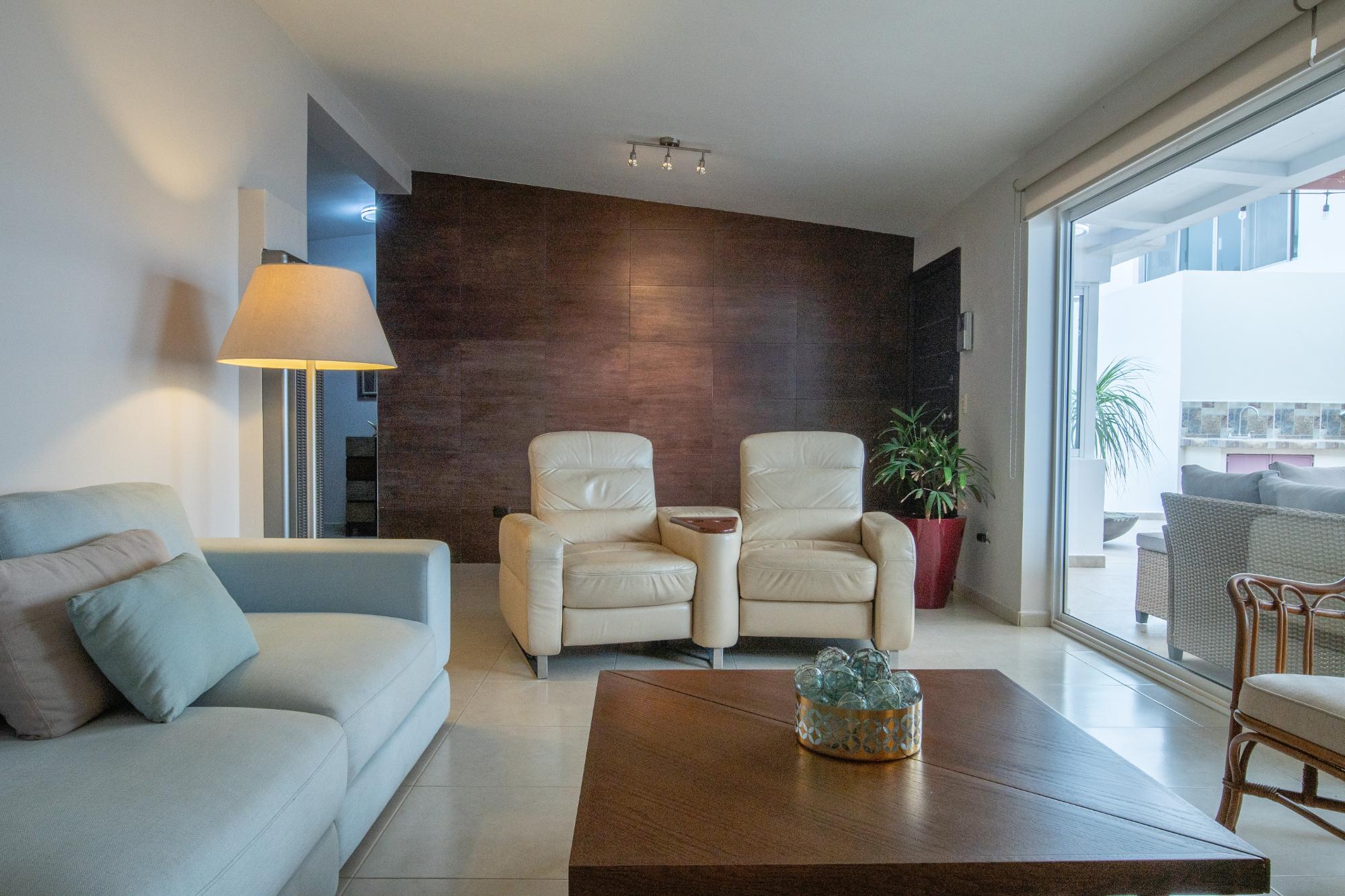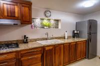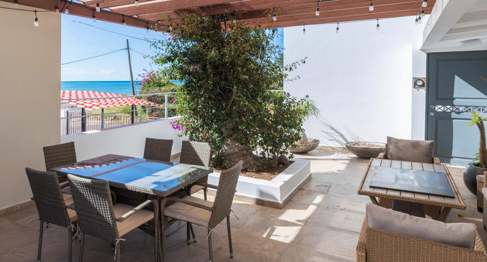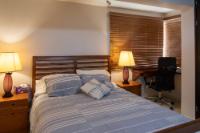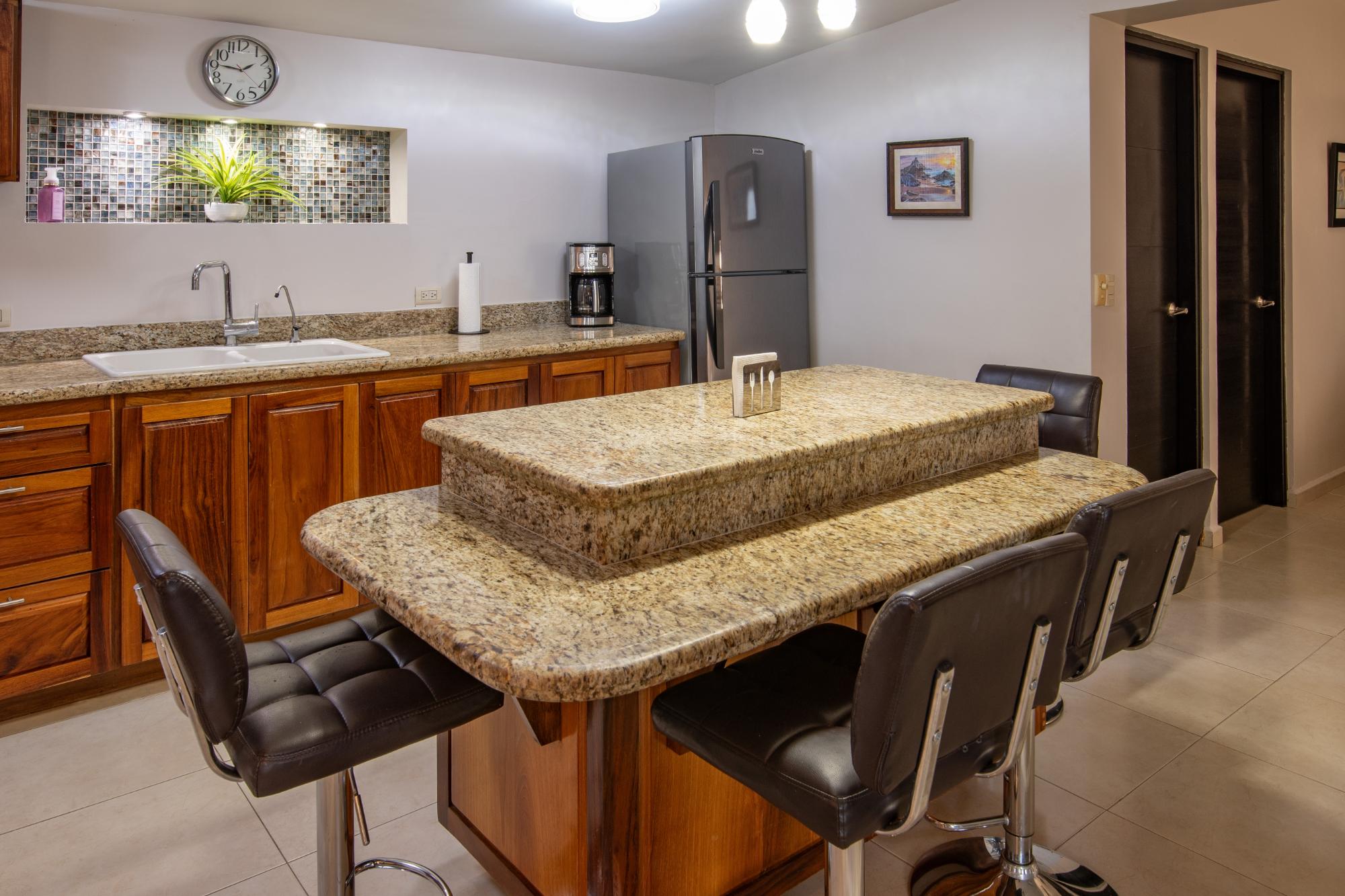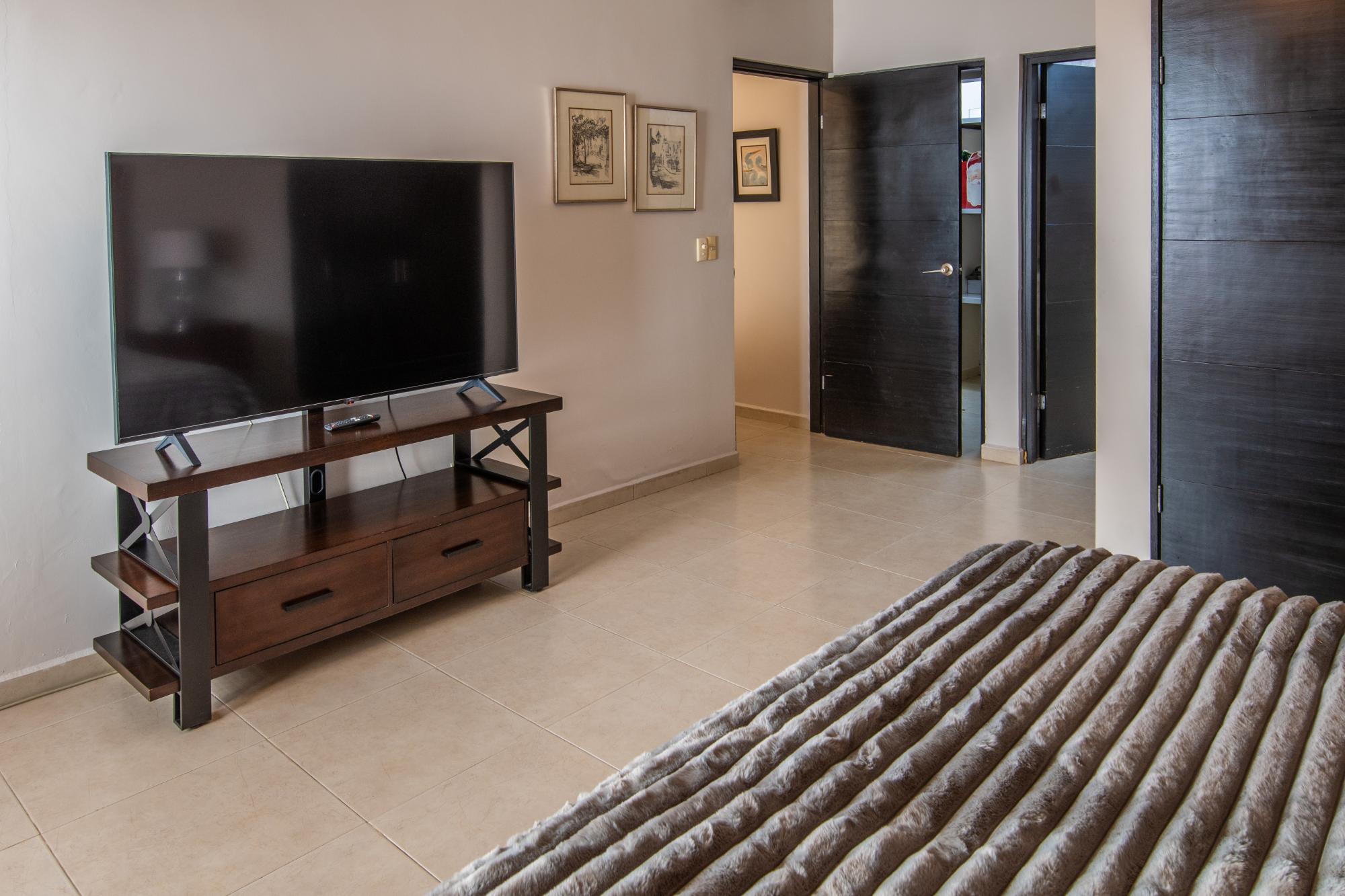 Located in the low-density residential community of Las Tinajas in Guaymas, this single-level home offers a practical layout, mature landscaping, and attractive views of the Sea of Cortez. The elevated position of the subdivision provides a quiet setting with a strong sense of privacy while remaining close to the coastline. The main house includes two bedrooms. The primary bedroom features an en-suite bathroom and access to an interior patio shared with the television room, allowing natural light into both areas. The second bedroom is served by a full bathroom located just outside the doorway. A third smaller bedroom with its own private bathroom is located separately from the main structure, making it well suited for guests or children. The home offers a comfortable terrace with a sea view and a built-in barbecue area, ideal for outdoor dining and relaxation. The property includes a welcoming front approach, off-street parking, and a functional layout.