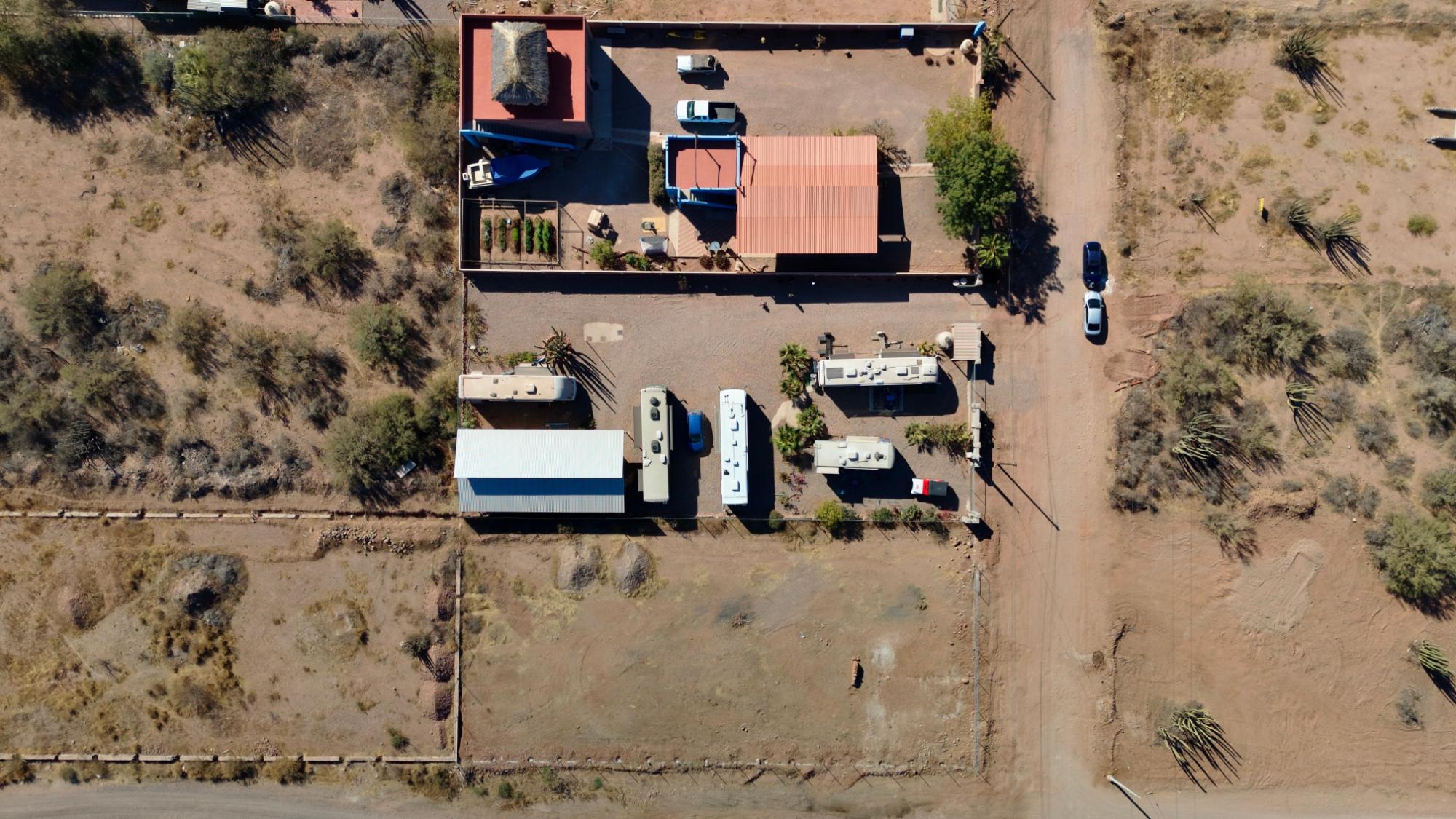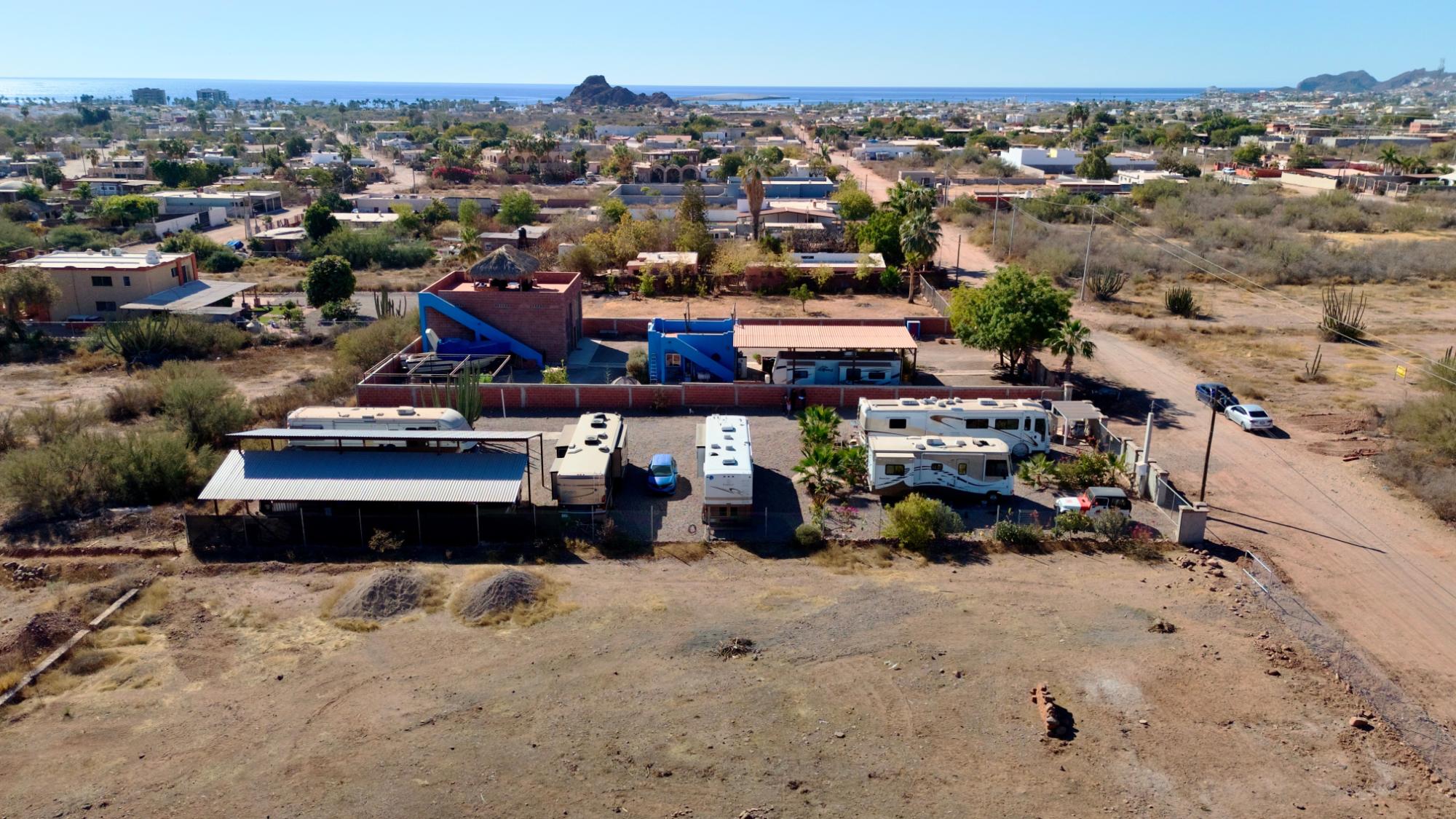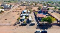 7 RV spaces, full hookups. Ample room for 42-foot rigs. Two 9,000-liter septic tanks (three chambers, reinforced) with two leaching fields on either side of the lot. 2,500-liter water tank with filtration and pressure system, laundry area. One 50-foot-long covered space and a 1-bedroom, 1-bathroom park model (Nomad 3585 with title) included. Ideal for a renter or caretaker. The park was built 3 years ago. Water lines and electrical conduits are 60 cm deep in the ground, set in sand. The builder installed two-phase power, using 600 meters of 6-gauge copper wire to feed the seven 30-amp connections individually.